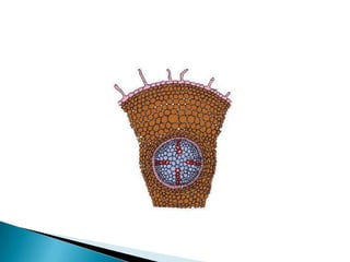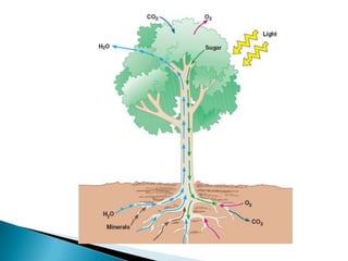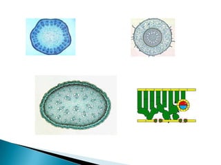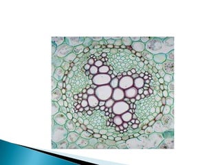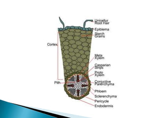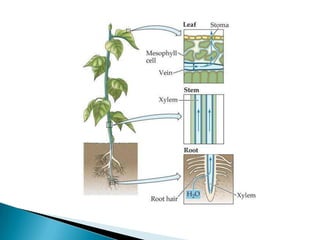 Plants have developed vascular systems to transport nutrients and water throughout their large bodies. The xylem transports water and minerals up from the roots through dead conductive cells, while the phloem transports organic nutrients down from the leaves through living cells. Transpiration is the evaporation of water from leaves, and creates a transpirational pull that drives water absorption by roots and transport through xylem vessels up the stem using capillarity and osmosis.