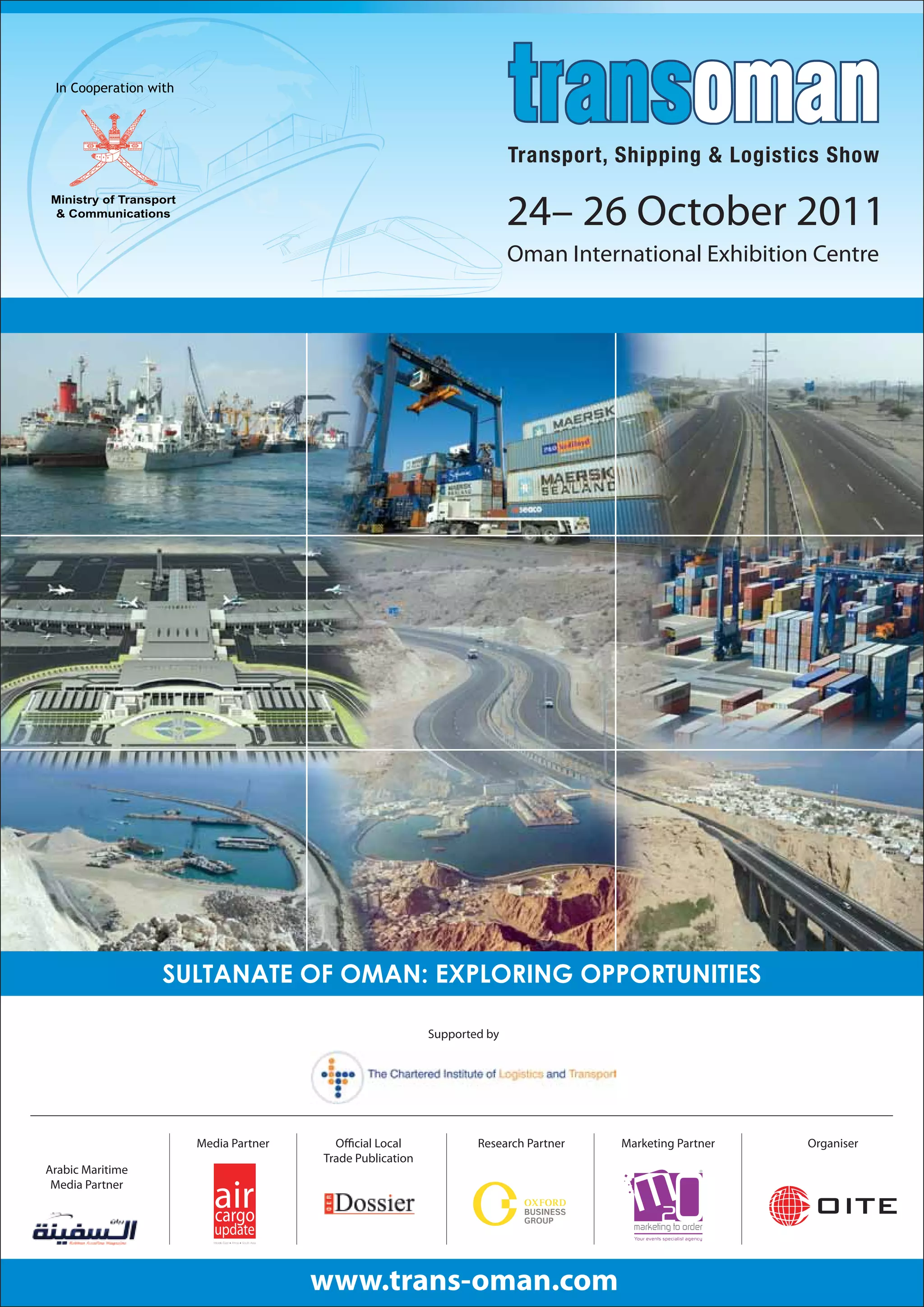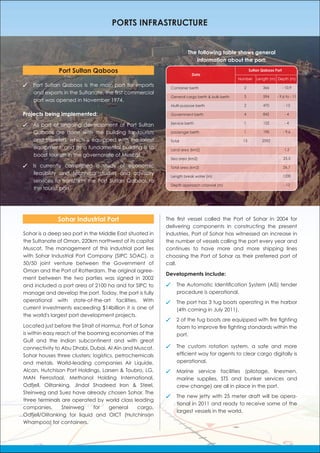 The document provides information about an exhibition in Oman from 24-26 October 2011 focusing on opportunities in the Sultanate of Oman. It discusses the history and development of the Port of Sohar and Freezone Sohar in Oman, including milestones, incentives for business, and facilities available. It also provides statistics and details about the Port of Salalah and Duqm Port and Dry Dock projects in Oman.