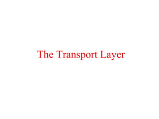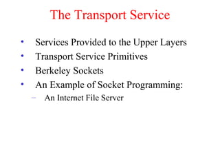 The document discusses various aspects of transport layer protocols including services provided, primitives, addressing, connection establishment and release, flow control, multiplexing, crash recovery, TCP and UDP, and performance issues. Specific topics covered include Berkeley sockets, an example file server, TCP and UDP headers, congestion control, and fast TPDU processing techniques.