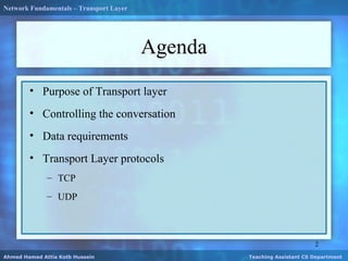 The document discusses the transport layer of network fundamentals, focusing on its purpose of facilitating end-to-end communication and data preparation for transport. It outlines key concepts such as port assignments, data segmentation, and protocols like TCP (connection-oriented) and UDP (connectionless), highlighting their reliance, flow control, and error checks. Additionally, it covers essential mechanisms like three-way handshakes, segment reassembly, and congestion control.