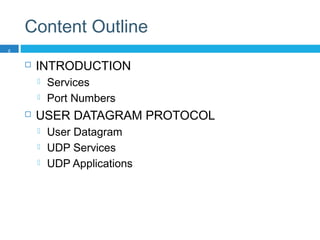 The document provides an overview of transport layer protocols including UDP, TCP, and SCTP. It discusses the services each protocol provides such as reliable vs unreliable data delivery. For TCP, it describes connection establishment and termination, segments, flow and error control using mechanisms like acknowledgments and retransmissions. It also discusses TCP timers used for retransmission timeouts and congestion control algorithms like slow start and congestion avoidance.