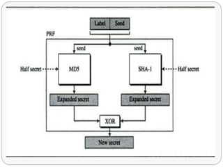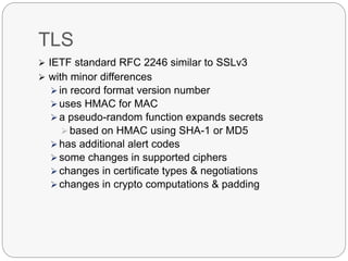 TLS is an IETF standard similar to SSL that provides cryptographic security and secure connections between parties through the establishment of a secure session. It aims to securely transmit data via record layer encapsulation and encryption, using techniques like cryptographic computations, MACs, and the generation of secrets through pseudorandom functions and data expansion. TLS supports various cipher suites, certificate types, and alert codes while making some changes compared to SSL in areas like record formatting, PRF usage, and handshake messaging.