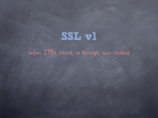 The document summarizes the evolution of the Transport Layer Security (TLS) protocol from versions 1.0 to 1.2. It describes the key components of TLS including the record protocol for fragmenting and transmitting encrypted data, handshake protocol for authentication and key exchange, and cipher suites for encryption algorithms. The TLS protocol provides secure communication over the internet by preventing eavesdropping, tampering, and forgery of messages between client and server applications.