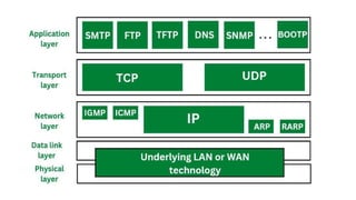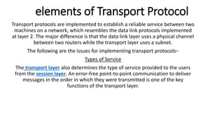 Transport protocols establish reliable communication between machines on a network. They provide services like error control, flow control, and multiplexing. The main transport protocols are TCP and UDP. TCP is connection-oriented and provides reliable, ordered delivery. UDP is connectionless and faster but unreliable. Both protocols use port numbers to identify sending and receiving processes and segment packet headers with fields like source/destination port and sequence numbers. DNS is an application layer protocol that maps domain names to IP addresses, enabling human-friendly web addresses. It uses a hierarchical system of root, TLD, and authoritative name servers to resolve names.