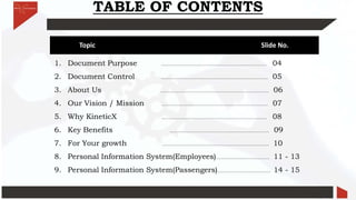 This document outlines KineticX's transport management system, emphasizing its confidential nature and the purpose of evaluating their services. It describes KineticX's mission to enhance customer relationships through innovative software solutions, detailing personal information systems for employees and passengers, vehicle tracking features, and analytics. The document highlights key benefits such as improved automation, decision-making, and reduced operational costs for businesses leveraging KineticX's technology.
