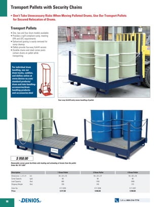 The document describes various models of transport pallets designed for safely moving drums, featuring four-way forklift access and spill containment capabilities to meet EPA and UFC standards. Models include single, double, and quadruple drum pallets with options for stackability, security chains, and separation walls for chemical protection. Prices range from $571.00 to $1,454.00 depending on the configuration and capacity.