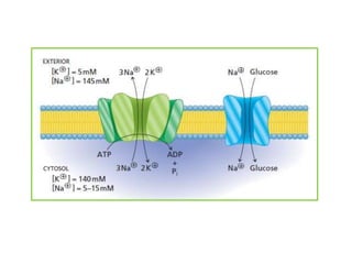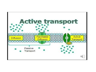 This document summarizes the different types of membrane transport systems in cells. There are two major categories: passive transport and active transport. Passive transport does not require energy and involves the diffusion of molecules down their concentration gradient. It includes simple diffusion, osmosis, and facilitated diffusion. Active transport requires energy in the form of ATP and transports molecules against their concentration gradient, such as the transport of glucose and ions via protein transporters. The document provides examples and details of each transport mechanism.