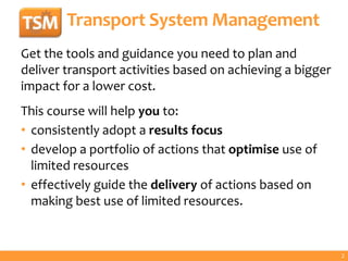 The document outlines a transport system management course scheduled for September 18-19, 2013, in Brisbane, focusing on effective transport activities using limited resources. It emphasizes improving performance, professional capability, and career opportunities through a blended learning approach and various course modules. The course is led by experts in the field and offers opportunities for earning professional development badges.