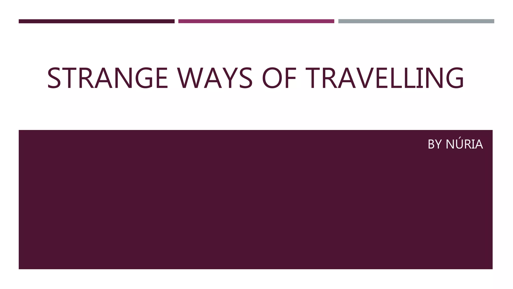 The document describes three unique modes of transportation: a beerbike in Wuppertal, Germany that is a 13 km long monorail train running above the city since 1903 carrying 25 million passengers annually; tuk tuks in Sri Lanka that allow charity volunteers to explore the country for 8 days by these small three-wheeled vehicles; and airships called Aeroscrafts that are making a comeback as passenger vehicles after zeppelins were discontinued following the 1937 Hindenburg disaster, with the first Aeroscraft undergoing testing and set to be available for rental in mid-2015.