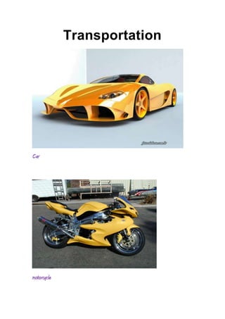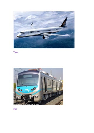 This document lists various modes of transportation including cars, motorcycles, planes, trains, bikes, subways, buses, submarines, vans, ships, ferries, rockets, shuttles, trucks, carts, helicopters, balloons, horses, carriages, bullet trains, karts, tricycles, ATVs, soapbox cars, camels, drudges, trailers, jet skis and jets.