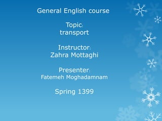 The document discusses the various modes of transport, including air, land, and water, highlighting their importance in trade and economic growth. It also touches on the environmental impacts of transportation and poses questions regarding personal experiences and opinions on transportation issues. Additionally, it outlines the technological differences and infrastructure requirements for each transport mode.