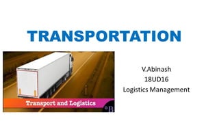Transportation involves moving goods from manufacturers to end users, while logistics manages the inward and outward movement of goods throughout the supply chain. There are various modes of transportation including air, water, railway, and road. Air transportation is the fastest but most expensive, moving lightweight goods quickly over long distances. Water transportation transports goods on water vessels and is cost-effective for bulk goods. Railway transportation moves goods on tracks between locations and is a cost-effective option for medium-distance cargo. Road transportation utilizes motor vehicles to move people and goods locally and provides flexibility but is limited by traffic.