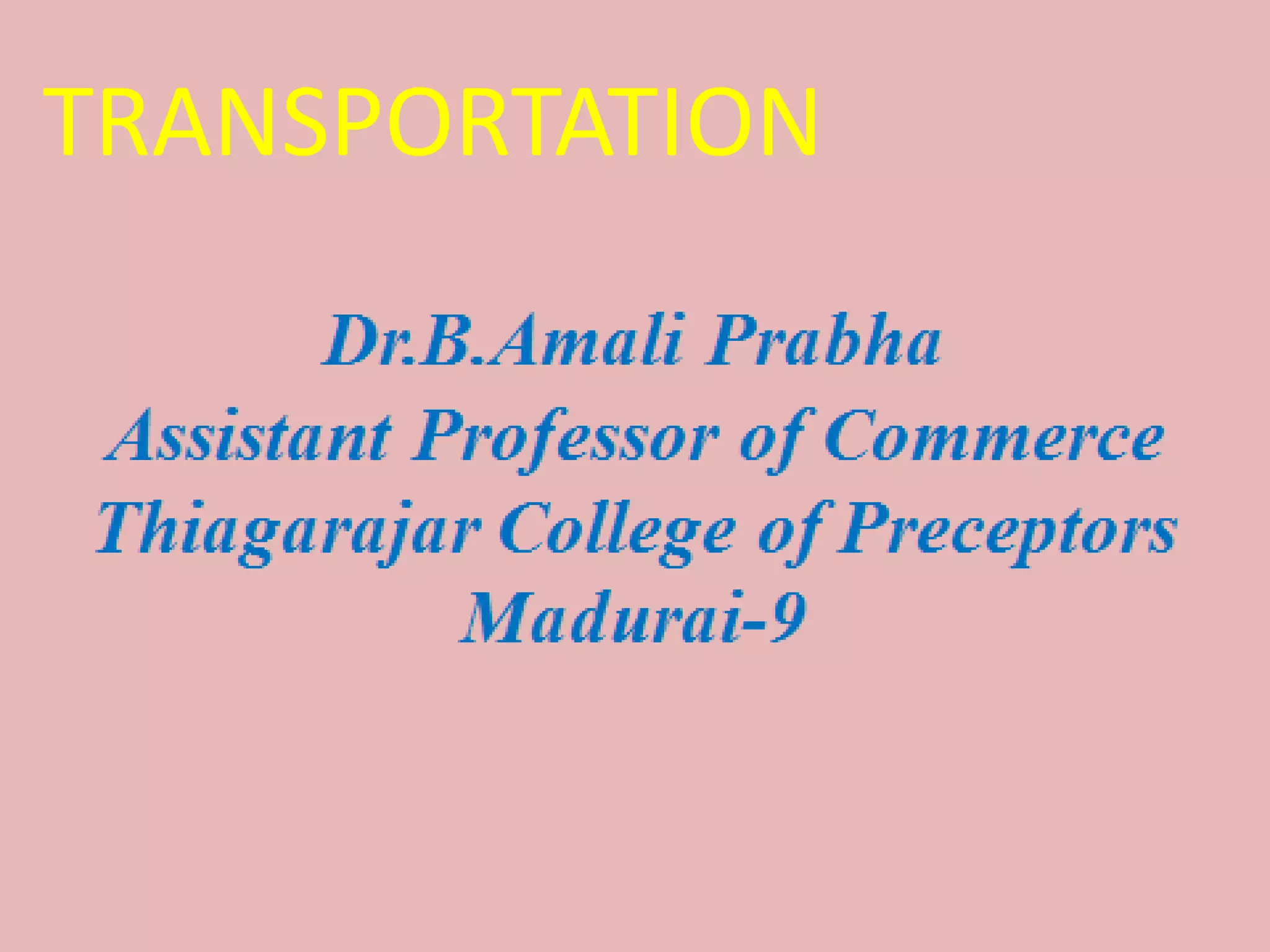The document provides an overview of transportation types such as surface, water, and air transport, along with their advantages and disadvantages. It also discusses the role of insurance in risk management, detailing types of insurance and regulatory frameworks in India. Additionally, it outlines the impact of transport services on business efficiency and economic growth.