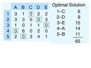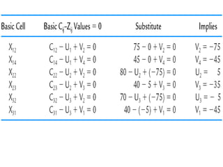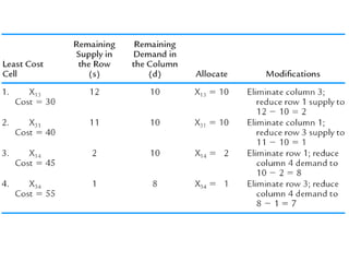 The document discusses the transportation problem (TP) and assignment problem (AP), both of which are special cases of linear programming, focusing on optimizing the distribution of goods to minimize costs. It outlines various methods for solving the TP, including the northwest corner method, least cost method, and Vogel's approximation method, as well as the Hungarian algorithm for the AP. Key concepts include establishing supply and demand equalities, cost matrices, and iterative strategies for minimizing transportation and assignment costs.