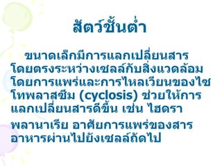 Transportation body 1. การลำเลียงสารในร่างกาย การลำเลียงสาร หมายถึง การนำสารอาหารที่ย่อยแล้ว ออกซิเจน เอนไซม์ ฮอร์โมน แร่ธาตุต่างๆ ฯลฯ ไปยังเซลล์และกำจัดของเสียต่างๆ ออกจากเซลล์รวมทั้งช่วยควบคุมอุณหภูมิของร่างกายให้เป็นปกติด้วย 2. สัตว์ชั้นต่ำ ขนาดเล็กมีการแลกเปลี่ยนสาร โดยตรงระหว่างเซลล์กับสิ่งแวดล้อมโดยการแพร่และการไหลเวียนของไซโทพลาสซึม ( cyclosis ) ช่วยให้การแลกเปลี่ยนสารดีขึ้น เช่น ไฮดรา พลานาเรีย อาศัยการแพร่ของสารอาหารผ่านไปยังเซลล์ถัดไป 3. 4. 5. สัตว์ชั้นสูง มีระบบหมุนเวียนเลือดช่วยในการลำเลียงสารไปยังส่วนต่างๆของร่างกายแบ่งออกเป็น 2 ระบบ คือ 1 ) ระบบหมุนเวียนเลือดแบบเปิด ( Opencirculatorysystem ) เป็นระบบที่เลือดไหลออกจากหัวใจแล้วมีทั้งอยู่ในเส้นเลือด ช่องว่างในลำตัวและที่ว่างระหว่างอวัยวะต่างๆ พบในสัตว์ไฟลัมอาร์โทรโพดา เช่น เเมลง กุ้ง กั้ง ปู ไรน้ำ ( ไรเเดง ) เพรียงหิน เเมงมุม เเมงป่อง เห็บ ไร เเมงดาทะเล ตะขาบ กิ้งกือ ฯลฯ และไฟลัมมอลลัสกา เช่น พวกหอย เป๋าฮื้อ หมึก ลิ่นทะเล ทาก หอยทาก 2 ) ระบบหมุนเวียนเลือดแบบปิด ( Closed circulatory system ) เป็นระบบที่เลือดไหลอยู่ในเส้นเลือดโดยตลอด พบในสัตว์ไฟลัมแอนเนลิดา ( ไส้เดือนดิน เเม่เพรียง ( ไส้เดือนทะเล ) ปลิงน้ำจืด ) คอร์ดาตา ( เพรียงหัวหอม เพรียงลอย เพรียงสาย เเอมฟิออกซัส ) และสัตว์มีกระดูกสันหลังทั้งหมด 6. 7. การลำเลียงสารในไส้เดือนดิน - มีหัวใจเทียม ( Pseudoheart ) บริเวณปล้องที่ 7-11 บีบตัวส่งเลือดไปยังส่วนต่างๆของร่างกาย - เซลล์เม็ดเลือดแดงมีนิวเคลียสแต่ไม่มีสี น้ำเลือดมีสีแดง เพราะมีฮีโมโกลบินละลายอยู่ 8. 9. การลำเลียงสารในพวกมอลลัสค์ - หอย มีระบบหมุนเวียนเลือดแบบเปิด โดยหัวใจส่งเลือดไปตามหลอดเลือดและแทรกซึมไปตามช่องรับเลือดสังผัสกับเนื้อเยื่อ โดยตรง - หมึก มีระบบหมุนเลียนเลือดแบบปิด เลือดมีฮีโมไซยานิน หัวใจมี 2 แบบคือ systemic heart รับเลือดจากเหงือกส่งไปส่วนต่างๆของร่างกายและ branchial heart ส่งเลือดไปแลกเปลี่ยนแก๊สที่เหงือก 10. การลำเลียงสารในแมลง - มีระบบหมุนเวียนเลือดแบบวงจรเปิด โดยเลือดจะไหลเวียนจาก หลอดเลือดเข้าสู่ช่องว่างของเนื้อเยื่อ ( Haemocoel ) - หัวใจของแมลงเกิดจากการพองตัวของหลอดเลือดในแต่ละปล้องเกิดเป็นห้อง ประมาณ 9 ห้อง มีอัตราการเต้นประมาณ 14 - 160 ครั้ง / นาที - เลือดแมลงประกอบด้วย น้ำเลือด ( plasma ) และเม็ดเลือด ( Hemocyte ) ไม่มีรงควัตถุในเลือดสำหรับลำเลียงก๊าซเพราะมีระบบท่อลมลำเลียงก๊าซได้อย่างมีประสิทธิภาพ 11. 12. การลำเลียงสารในสัตว์มีกระดูกสันหลัง สัตว์ครึ่งบกครึ่งน้ำ มีหัวใจ 3 ห้อง ( atrium 2 และ ventricle 1 ) มีหน้าที่ต่างกันดังนี้ - ห้องบนขวารั