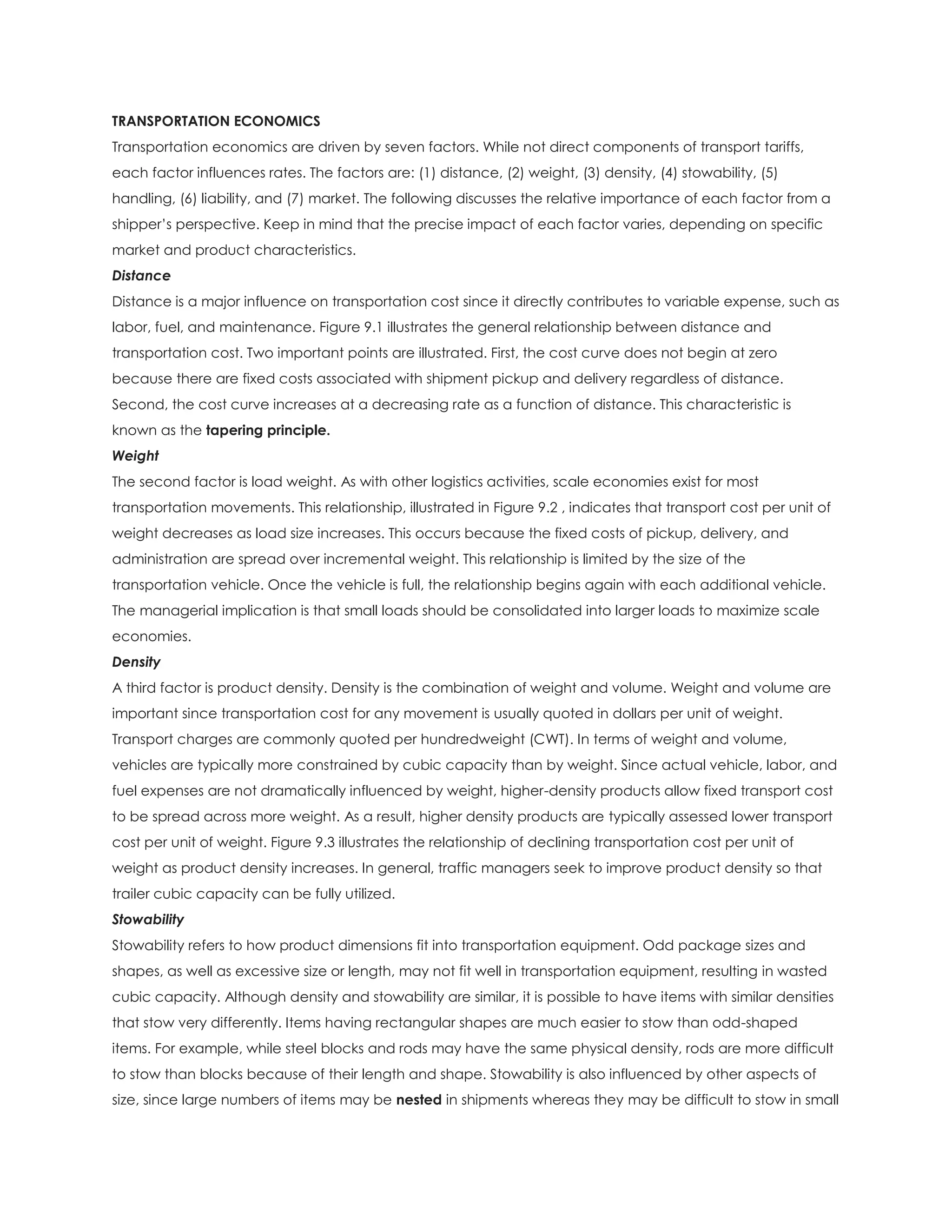 Transportation costs are influenced by seven key factors: distance, weight, density, stowability, handling, liability, and market conditions. Carriers consider these factors and allocate costs into variable, fixed, joint, and common categories when determining pricing strategies. Carriers typically employ either a cost-of-service approach to set minimum rates based on expenses or a value-of-service strategy to charge more for critical goods, though often use a combination of these based on trade-offs between costs incurred and value to shippers.