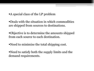 This document describes a transportation model, a special type of linear programming problem where commodities are shipped from sources to destinations to minimize total shipping costs while meeting supply and demand requirements. It explains that the transportation model can be expressed in a matrix format showing unit shipping costs from suppliers to demanders. The document also outlines the North-West-Corner Method for solving transportation models, which allocates shipments to the northwest corner variable and adjusts remaining supply and demand at each step until all units are allocated.