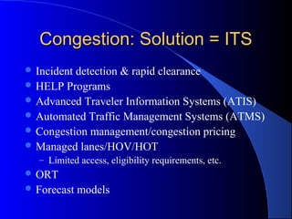 Transportation operations and ITS projects are difficult to plan for and fund continuously due to the nature of software development and communications needs. The document discusses funding opportunities through the American Recovery and Reinvestment Act and other federal, state, and local sources. It emphasizes having defensible plans, including cost-benefit analyses, to build ITS infrastructure and including ITS elements in ongoing transportation projects. Patience, understanding political processes, and monitoring multiple funding cycles are advised for successful long-term ITS funding.