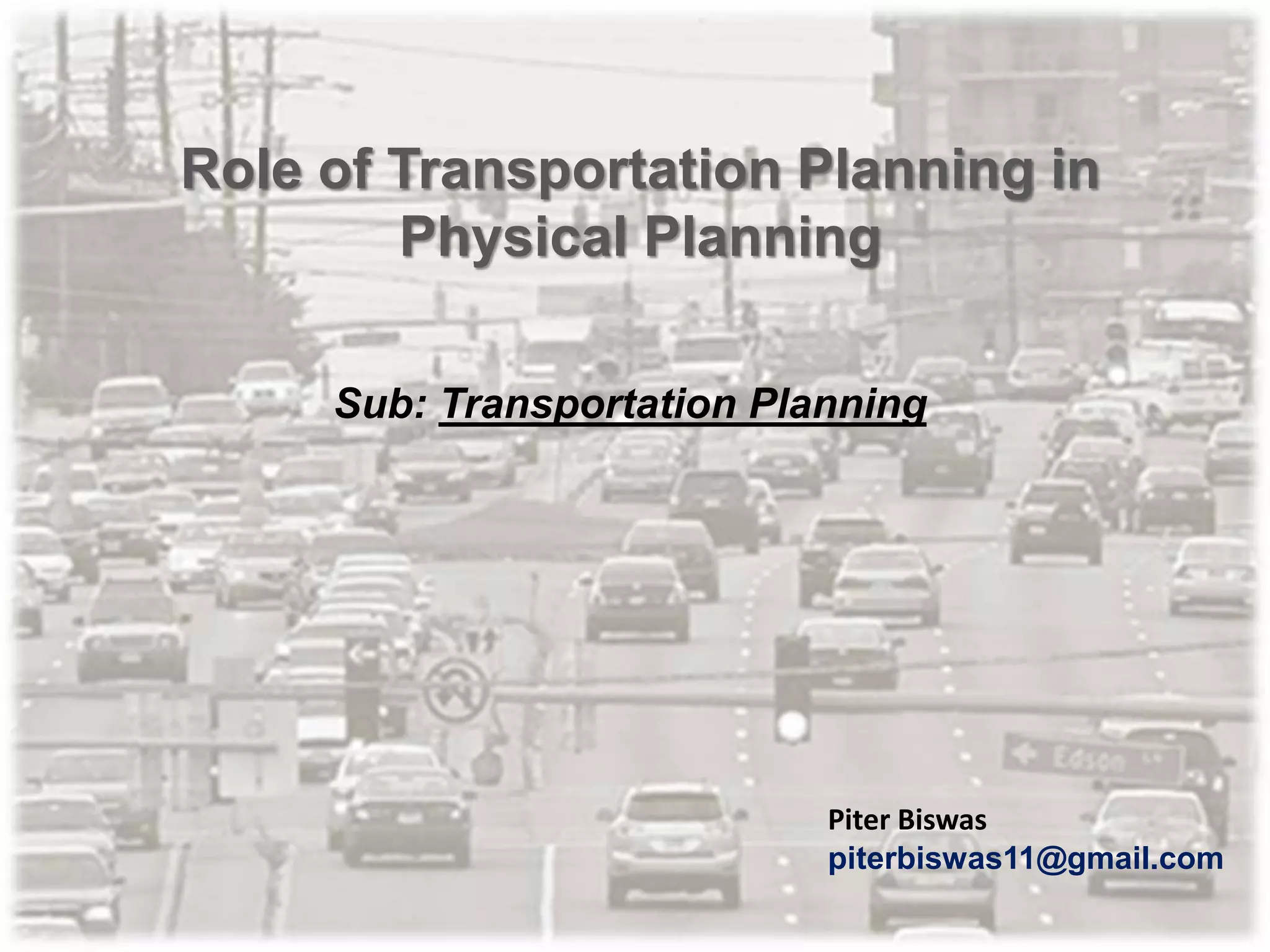 The document outlines the crucial role of transportation planning in physical planning, emphasizing how better connectivity is essential for urban development and economic growth. It discusses the relationship between urban density and transportation, describes effective strategies like transit-oriented development, and presents Curitiba as a case study for successful integration of transportation and urban planning. The findings highlight the significance of a well-planned transportation system as a foundation for sustainable urban infrastructure and accessibility.