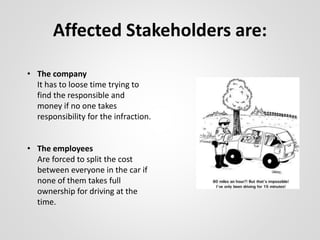 The company was experiencing a problem where vehicles used for work would incur traffic fines and infringements, but drivers would not take responsibility for these fines. This causes issues for finding responsible parties and splitting costs. The proposed solution is a Vehicle Access Database that requires employees to log a request to use a company vehicle, providing details of use. This creates a record of the vehicle usage, driver, dates, and locations to determine responsibility for any fines received. The system would be accessible via web and mobile apps connected to a centralized database.