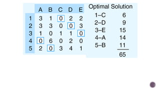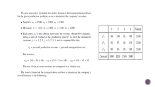 El documento presenta modelos de red en la optimización de problemas de transporte, asignación y flujo máximo, destacando su formulación y solución a través de programación lineal. Describe en detalle el problema de transporte, que busca minimizar los costos de envío al distribuir productos de varios centros de suministro a diferentes destinos. También se ofrecen ejemplos prácticos de problemas de transporte, incluyendo la formulación de funciones objetivo y restricciones necesarias para resolverlos.