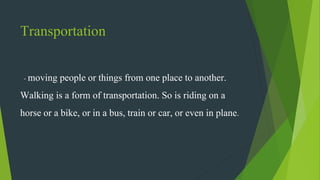 Transportation involves moving people or things from one place to another via various modes like walking, biking, vehicles, ships, and planes. The document outlines the historical evolution of transportation systems through seven eras from pre-industrial to modern times. Key developments include the introduction of stagecoaches, railways, automobiles, air travel, and factors influencing the selection of transportation modes.