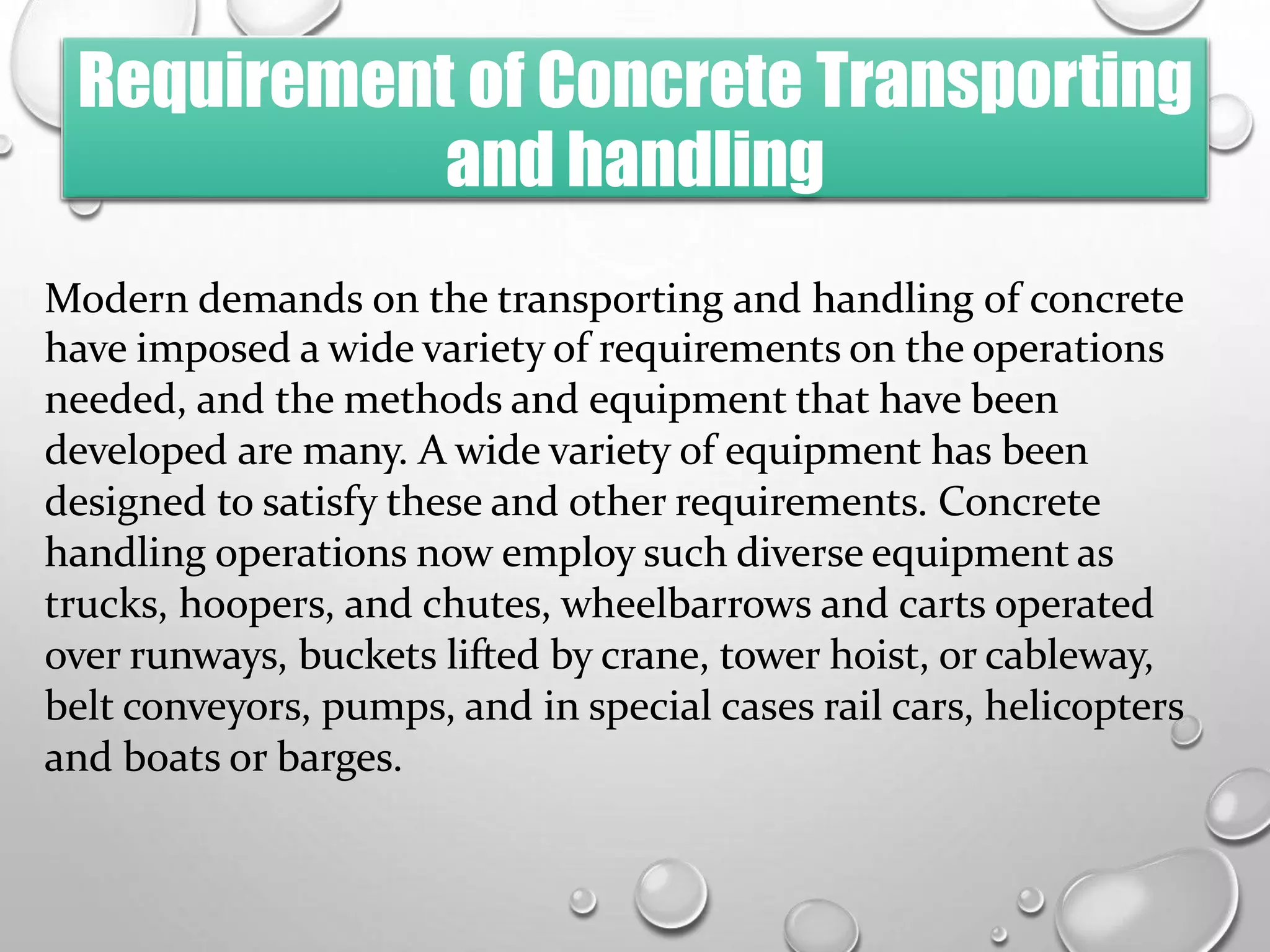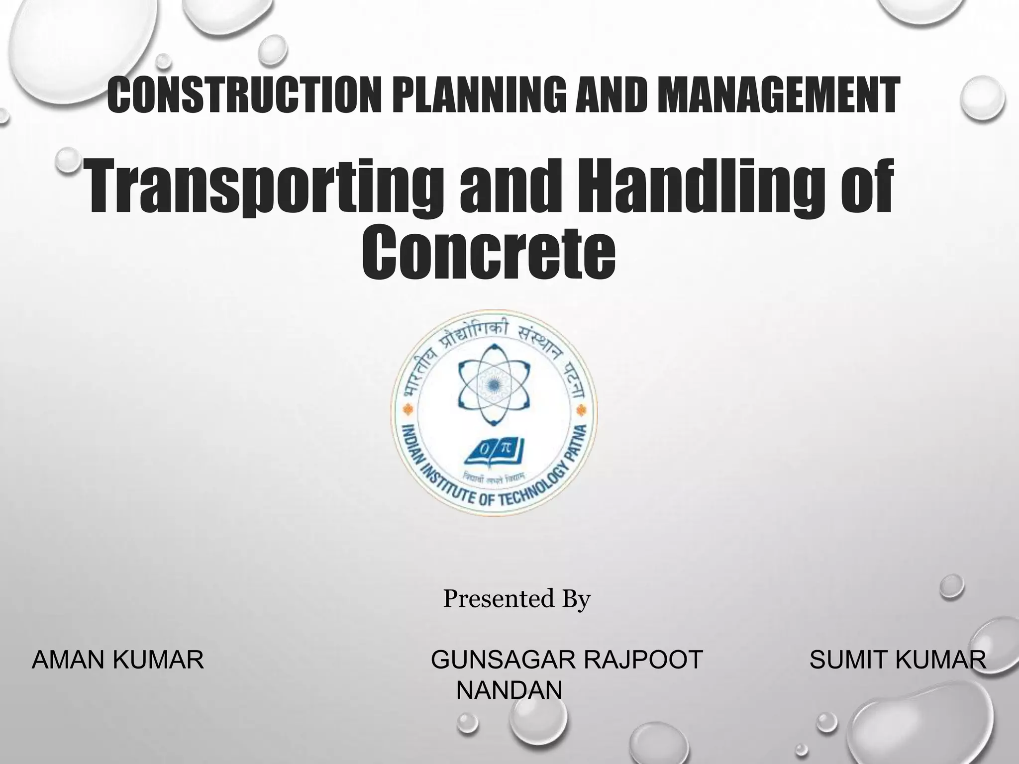 The document discusses various methods for transporting and handling concrete on construction sites, including wheelbarrows, skips and hoists, belt conveyors, transit mixers, buckets used with cranes and helicopters, pumps, and screw spreaders. A wide range of equipment has been developed to transport concrete given modern demands, with considerations for advantages and limitations of each method depending on the transport distance and placing conditions. Pumps are commonly used to convey concrete over long distances both horizontally and vertically on multi-story buildings and bridges.