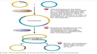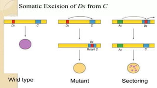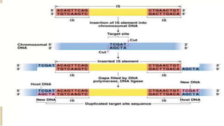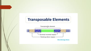 Transposable elements are DNA sequences that can change positions within a genome. They were first discovered by Barbara McClintock in corn in the 1940s. There are three main mechanisms of transposition: replicative, conservative, and retrotransposition. Transposable elements are found in both prokaryotes and eukaryotes and can cause mutations, gene alterations, and genetic diversity. They have applications in mutagenesis and gene expression studies but can also contribute to genetic diseases.