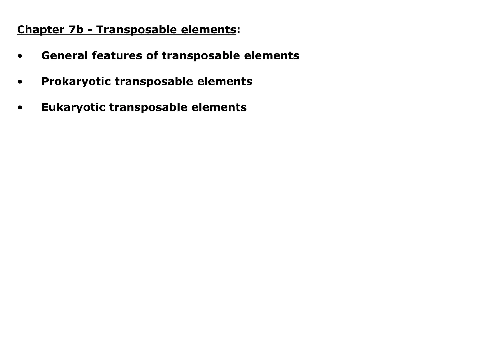 Chapter 7b discusses transposable elements, which are mobile genetic components in prokaryotic and eukaryotic genomes that can relocate within the genome, leading to genetic mutations and contributing to evolution. It covers two types of transposable elements: insertion sequences and transposons, detailing their mechanisms of movement such as cut-and-paste and copy-and-paste, as well as their effects on gene expression and genomic structure. The chapter also highlights significant discoveries by Barbara McClintock regarding plant transposons and their role in kernel color variations in corn.