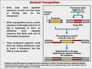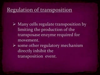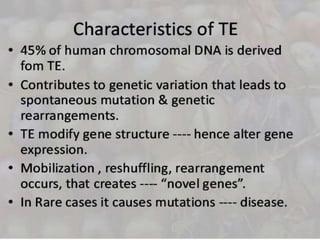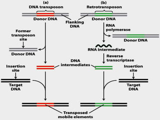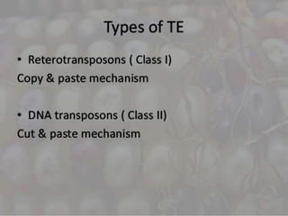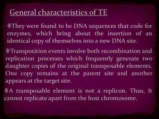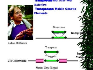 This document summarizes information about transposons. It discusses that Barbara McClintock discovered transposons in maize in 1948 and was awarded a Nobel Prize for this discovery in 1983. It describes transposons as sequences of DNA that can move to different locations within a genome. The document outlines different types of transposons, including Class 1 and Class 2, and their mechanisms of transposition. It also discusses transposons' involvement in disease.