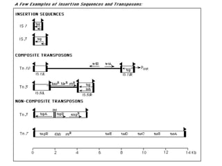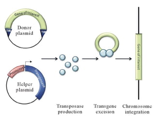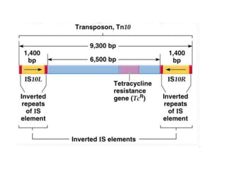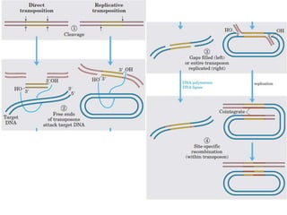 This document provides an overview of transposable elements (TEs). It discusses that TEs are DNA sequences that can move within genomes. There are two major classes of TEs - retrotransposons which move via an RNA intermediate, and DNA transposons which move directly through a cut-and-paste or copy-and-paste mechanism. The document outlines different types of TEs found in bacteria, eukaryotes, and the human genome. It also discusses the impact of TEs in causing mutations and their applications in genetic engineering and mutagenesis experiments.