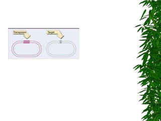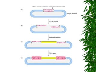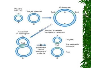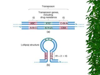 Transposable elements, or transposons, are DNA sequences that can move within genomes. There are two main classes of transposons: those that encode proteins to directly move the DNA element, and retrotransposons that move via an RNA intermediate using reverse transcriptase. Barbara McClintock discovered transposons in the 1940s and 1950s through her studies of maize, where she observed "jumping genes" that caused mosaic color patterns in kernels. Transposons are found in both prokaryotes and eukaryotes and can insert into new locations in genomes, sometimes causing mutations. They have played an important role in genome evolution and can continue to induce genetic variation.