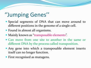 Barbara McClintock discovered transposons in the 1940s while studying maize. Transposons are segments of DNA that can move within genomes. There are two classes - Class 1 retrotransposons copy and paste RNA into DNA, while Class 2 DNA transposons cut and paste DNA segments. Transposons make up a large portion of many genomes and can cause mutations, but may also create genetic diversity that benefits hosts over time. McClintock received the Nobel Prize for discovering transposons and proposing they play a regulatory role in gene expression.