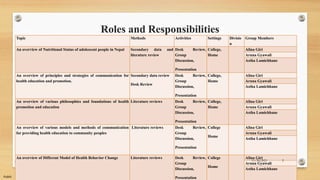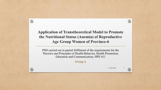 The document outlines a project using the transtheoretical model to improve nutritional status, specifically addressing anemia among reproductive-age women in Province 6, Nepal. It includes an analysis of current nutritional deficiencies, the implementation of a health education program, and a structured plan for addressing these issues through targeted interventions. Key objectives are to raise awareness about nutrition, facilitate behavior change, and improve health outcomes for women and children in the region.