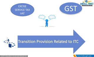 The document outlines the transitional provisions under GST for cenvat and input tax credit, detailing scenarios for registered individuals transitioning from the previous tax framework to GST. It covers eligibility criteria for taking credit on unavailed cenvat, input held in stock, and conditions for manufacturers of exempted and non-exempted goods. Additionally, it discusses regulations for capital goods and implications of switching from a normal scheme to a composition scheme under GST.