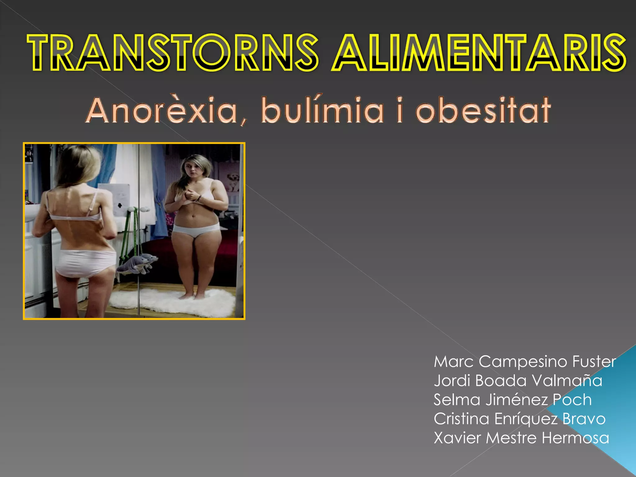 Què es laBulímia? La bulímia o bulímia nerviosa és un trastorn mental relacionat amb el menjar. La seva característica essencial consisteix que la persona sofreix episodis de atracones compulsius, seguits d'un gran sentiment de culpabilitat i sensació de pèrdua de control. Sol alternar-se amb episodis de dejuni o de molt poca ingesta d'aliments, però al poc temps tornen a sofrir episodis d'ingestes compulsives. Un atracó consisteix a ingerir en un temps inferior a dues hores una quantitat de menjar molt superior a la qual la majoria d'individus menjarien. A pesar que el tipus de menjar que es consumeix en els atracons pot ser variada, generalment es tracta de dolços i aliments d'alt contingut calóric.Els atracons es realitzen d'amagat o el més disimuladament possible.