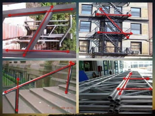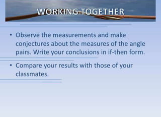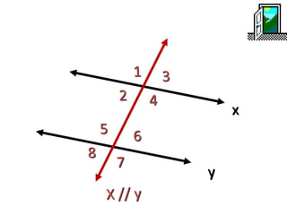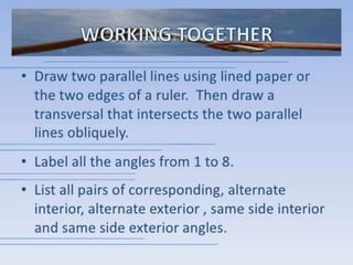 This document discusses angles and their properties. It defines terms like transversal, interior angles, exterior angles, corresponding angles, alternate interior angles, and alternate exterior angles. It explains that if two parallel lines are cut by a transversal, then corresponding angles, alternate interior/exterior angles, and interior/exterior angles on the same side of the transversal are congruent. There are examples of naming angles and solving for unknown angles given information about parallel lines cut by a transversal.