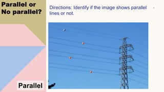 This document provides information about parallel lines and transversals. It defines parallel lines and transversals, and describes the different types of angles formed when parallel lines are cut by a transversal, including corresponding angles, alternate interior angles, alternate exterior angles, same-side interior angles, same-side exterior angles, linear pairs, and vertical angles. It also provides examples of using these angle properties to solve for unknown angle measures.