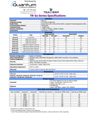 Tranzeo is announcing their new TR-5a Series radios that operate in the 5.3-5.8 GHz range. These radios can be configured as an access point, point-to-point bridge, or client adapter. They have features such as dual Ethernet ports, support for tunneling protocols, and low power requirements of only 7 watts. The radios also include accessories like high gain directional antennas and mounting hardware.