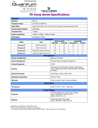 Tranzeo is announcing their new TR-5amp series of 5GHz radios that can function as an access point, point-to-point bridge, or client adapter. Key features include dual Ethernet ports, support for VPN and other tunneling protocols, wireless distribution system for access points, and alignment LEDs for easier installation of point-to-point and client configurations. The radios provide up to 25dBm of output power and have various high gain antenna options ranging from 24dBi to 32dBi panels and dishes.