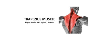 The trapezius muscle is a large, triangular muscle located on the back and sides of the neck and shoulders. It has three parts - upper, middle, and lower. The upper fibers elevate the shoulders, the middle fibers retract the shoulder blades, and the lower fibers depress the shoulders. The trapezius works with other muscles to control shoulder movement and stabilize the shoulder blades. It is innervated by the accessory nerve and functions to elevate, retract, and rotate the scapula.