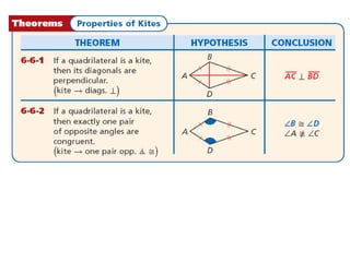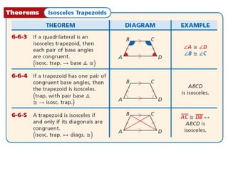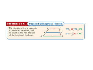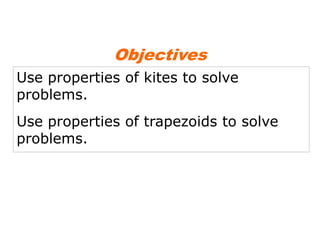 This document contains a geometry lesson on kites and trapezoids. It includes examples of using properties of kites and trapezoids to solve problems, such as finding missing side lengths and angle measures. The examples guide students through setting up and solving multi-step geometry problems involving kites, isosceles trapezoids, midsegments, and theorems about angles, sides, and segments.