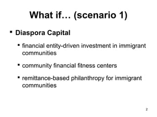 The document outlines the creation of the Transnational Immigrant Innovation Network (TIIN), which aims to address the financial and social needs of low-income immigrant communities through innovative solutions and partnerships. It discusses various scenarios for leveraging diaspora capital and creating tools such as a transnational index to enhance awareness and opportunities for these communities. The document highlights the organization's mission to foster scalable innovations that improve community systems and their commitment to developing resources for immigrant populations.