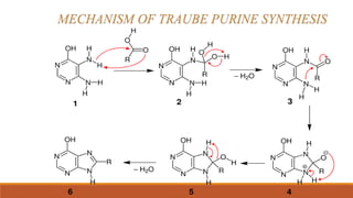 This document discusses Traube purine synthesis and several purine derivatives including mercaptopurine, theophylline, and thioguanine. It provides information on: