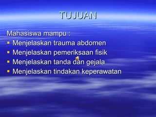 Dokumen ini membahas trauma abdomen, termasuk mekanisme, jenis, dan tanda serta gejala yang muncul. Penatalaksanaan melibatkan pemeriksaan fisik, identifikasi komplikasi, dan tindakan keperawatan yang tepat. Fokus utama adalah pada pendekatan diagnostik dan manajemen pasien untuk mencegah komplikasi serius.