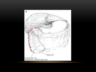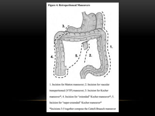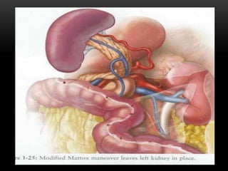 The document describes techniques for crash laparotomy in trauma patients. It discusses approaches for temporary bleeding control like packing and supraceliac aortic control. It also outlines the order of exploration as inframesocolic, supramesocolic, lesser sac, and retroperitoneum. Maneuvers like the Mattox maneuver and Kocher maneuver are explained to provide exposure and access during retroperitoneal exploration. The key decision of pursuing definitive repair versus damage control surgery is also covered, focusing on indications like severe physiologic insult or an injury pattern that would be difficult to assess or repair initially.