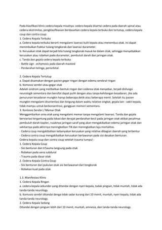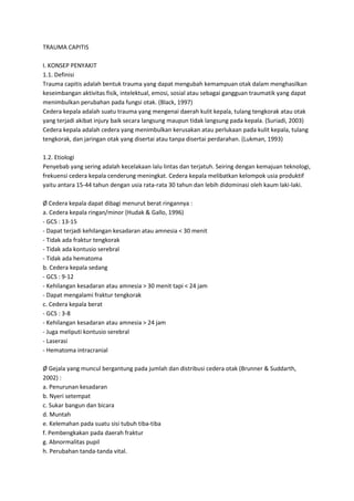 Trauma capitis adalah cedera pada kepala yang dapat mempengaruhi fungsi otak dan dapat dibagi menjadi ringan, sedang, dan berat berdasarkan gejala dan tingkat kesadaran. Penyebab utama trauma capitis adalah kecelakaan lalu lintas dan terjatuh, dengan manifestasi klinis yang bervariasi berdasarkan tingkat keparahan cedera. Penatalaksanaan meliputi tindakan medis konservatif dan operatif sesuai dengan kondisi pasien.