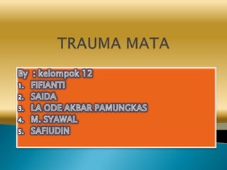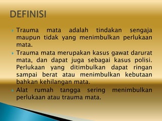 Trauma mata dapat mengenai berbagai bagian mata dari kornea hingga retina dan menyebabkan berbagai gangguan seperti perdarahan, kebutaan, bahkan kehilangan mata. Jenis trauma mata meliputi trauma fisik, kimiawi, dan termal yang menimbulkan berbagai gejala seperti penglihatan kabur, perdarahan, dan kebutaan. Diagnosa dan penanganan trauma mata memerlukan pemeriksaan mata serta radiologi dan terapi obat untuk m