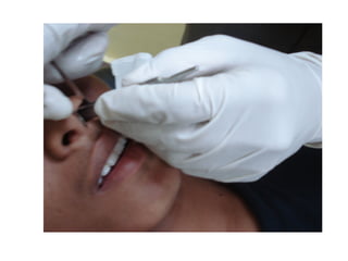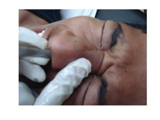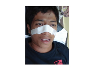 The document describes abnormalities seen in a trauma patient including a deviated nose and bruising near the eye. The possible injury is a deviated nasal septum from nasal trauma. The injury should be managed through repositioning of the deviated septum.