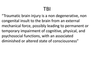 - TBI is defined as an insult to the brain from an external force, which can lead to temporary or permanent impairment. It affects over 1.7 million people annually in the US.